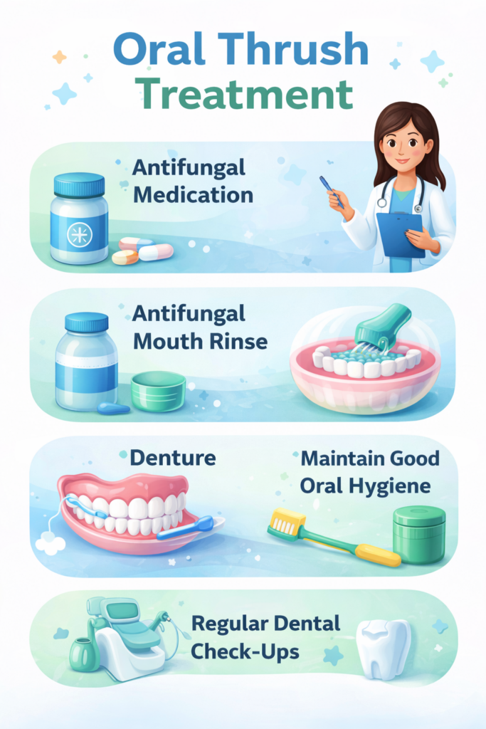 Treatment typically involves antifungal medications, which may be topical or systemic, depending on the severity of the infection. Home remedies for oral thrush can include rinsing with saltwater, but professional treatment is often necessary.